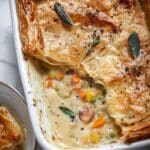 For a dinner party, I’ve served this pot pie in individual ramekins topped with mini rounds of puff pastry and a tiny sage leaf. It’s a charming presentation that feels special but takes no extra effort! Another fun idea is to decorate the top with extra cut-out pastry shapes like leaves or pumpkins for an autumn-themed meal.