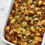 - Make Ahead and Reheat: This stuffing can be made a day ahead. Refrigerate after assembling, then bring to room temperature for about 60 minutes before reheating. Reheat covered in the oven when ready to serve.