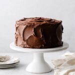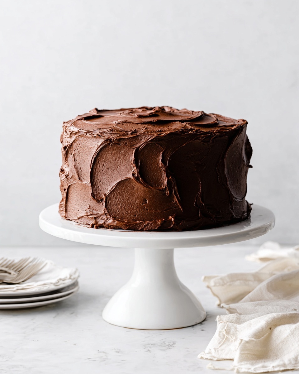 - Assemble Cake: Once cooled, layer the cake by spreading vegan chocolate buttercream frosting between each cake layer and then frost the outside of the assembled cake evenly.