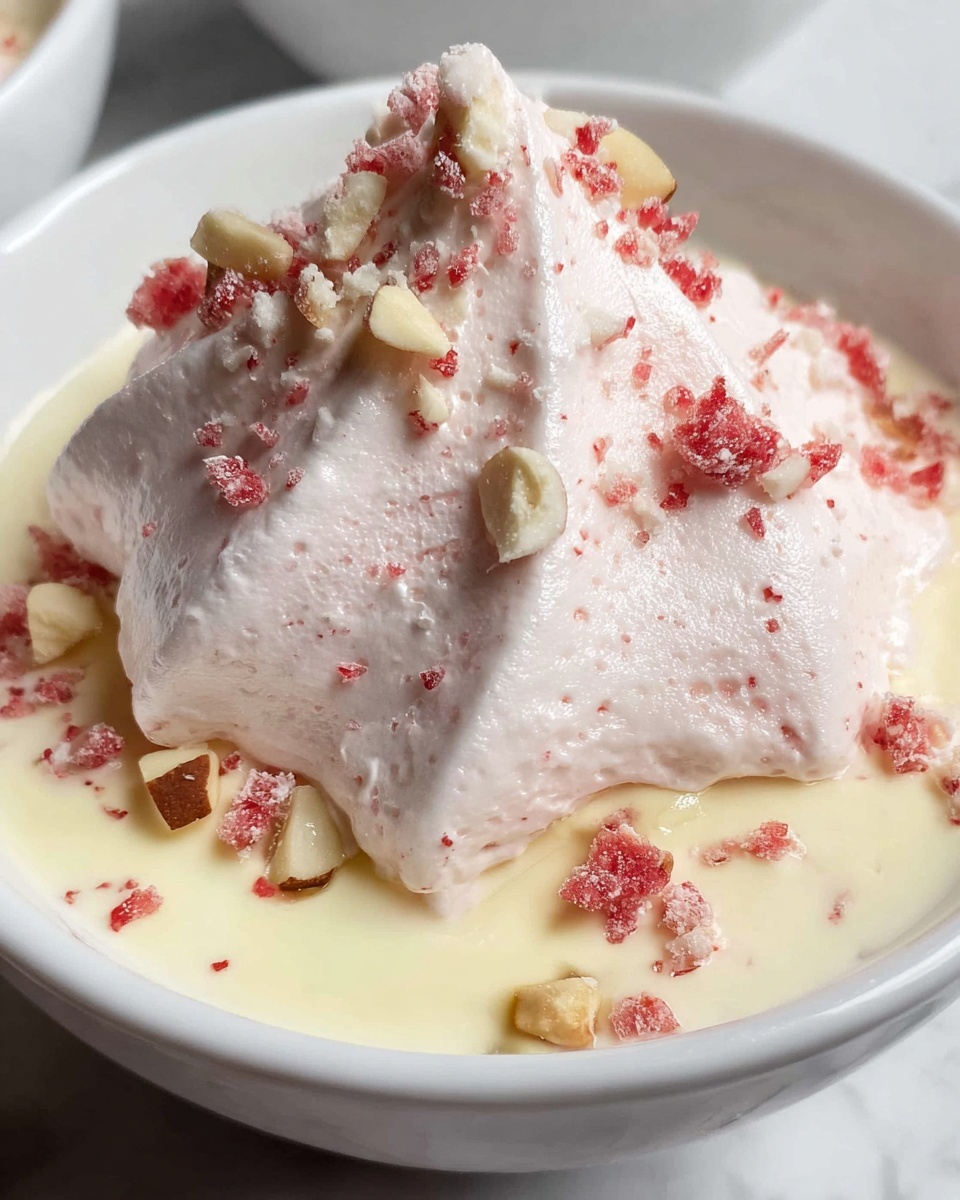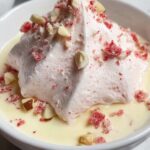 Spoon a generous layer of the cooled crème Anglaise into martini glasses or pretty glass bowls—this will be your “sea.” Gently nestle a baked meringue cloud on top. For the finishing flourish, sprinkle with finely chopped pink praline. And voilà—you’ve got yourself a stunning dessert centerpiece that tastes as incredible as it looks.