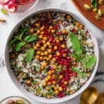 A vibrant and festive Pomegranate Rice Salad featuring cooked long grain rice tossed with a fragrant dressing, scallions, garlic, toasted pistachios, fresh herbs, and juicy pomegranate arils. This versatile and colorful dish is perfect as a holiday side or a wholesome accompaniment year-round, offering a balance of fresh, nutty, and citrus flavors.