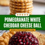 A festive and delicious pomegranate white cheddar cheese ball made with cream cheese, shredded white cheddar, chopped pecans, green onions, and a touch of salt. Coated in juicy pomegranate seeds for a beautiful and flavorful appetizer perfect for holiday gatherings or any party.