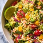 This vibrant Prawn Mango Avocado Summer Salad with Lime Dressing combines succulent cooked prawns, sweet mango, creamy avocado, and fresh vegetables tossed with a zesty lime and garlic dressing. Perfect for a light, refreshing, and satisfying summer meal, it’s ideal for sharing or enjoying as a healthy lunch or dinner option. The salad incorporates cooked risoni (or orzo) for added texture and heartiness, balanced with peppery arugula and bright cherry tomatoes.