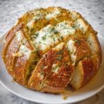This Pull Apart Garlic Bread is a deliciously cheesy and garlicky appetizer made with a crusty sourdough loaf. The bread is sliced in a grid pattern and generously infused with melted garlic butter, shallots, fresh parsley, and a blend of shredded Havarti and mozzarella cheeses. Baked until golden and bubbly, it’s perfect for sharing, served warm with marinara sauce for dipping.