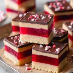 This Raspberry Caramel Millionaires Shortbread is a decadent vegan and gluten-free dessert featuring a buttery almond and flour base, a tart and smooth raspberry jelly layer, topped with a rich cashew caramel and a glossy vegan chocolate layer. Finished with optional crunchy freeze-dried raspberries, this indulgent treat combines multiple textures and flavors for a show-stopping sweet perfect for any occasion.