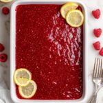 Right before serving, spread the reserved raspberry jam on top and decorate with fresh raspberries and bright lemon slices. I actually love this last-minute garnish because it instantly brings this dessert to life and makes it look stunning on any table.