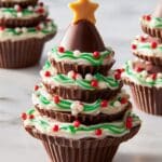 These adorable Reese’s Trees are the perfect no-bake Christmas treat, combining layers of mini Reese’s cups, regular Reese’s cups, and Hershey’s kisses decorated with festive icing, sprinkles, and stars. Easy to make and visually delightful, they bring a cute and tasty element to your holiday dessert table.
