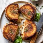 Heat a skillet over medium heat and place your sandwiches in one by one. Cook them 3-5 minutes per side or until the bread is golden brown and crispy, and the cheese is fully melted. If your heat is too high, the bread will burn before the cheese melts, so patience is key! I typically press down gently with a spatula to ensure good contact and a beautiful crust.