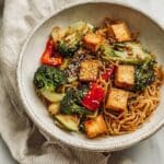 Personally, I haven’t frozen this dish because the texture of noodles can change in the freezer—but if you want, you can freeze the tofu and veggies separately. When reheating, defrost overnight in the fridge and reheat gently to keep the tofu from getting rubbery.
