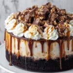 - Serve: Before serving, top the cheesecake with homemade whipped cream, additional drizzles of chocolate and caramel sauces, and sprinkle with extra chopped mini Snickers bars for added texture and presentation. Slice into 12 to 14 pieces and enjoy.
