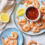 If you happen to have leftovers (which is rare in my house!), store peeled shrimp in an airtight container with a splash of lemon juice and cover your cocktail sauce separately. Refrigerate up to 2 days for best freshness.