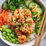 Start with a fluffy scoop of rice or your rice-lettuce combo as the base. Layer on the cucumber, jalapeño, shredded carrot, warm edamame, and then spoon the saucy shrimp on top. Finish it off with a generous drizzle of spicy mayo, toasted sesame seeds, sliced green onions, and if you’re like me and can’t get enough heat, an extra splash of Sriracha. Now dig in and enjoy the magic!