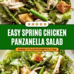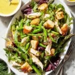 A delightful Spring Chicken Panzanella Salad featuring juicy roasted chicken, crisp asparagus and snap peas, mixed greens, and crunchy homemade croutons all tossed in a bright, tangy red wine vinaigrette infused with fresh dill and mint. This salad blends warm roasted flavors with fresh, crisp vegetables for a light yet satisfying meal perfect for spring or summer.