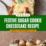 A festive and indulgent Sugar Cookie Cheesecake featuring a buttery sugar cookie crust, vanilla speckled cheesecake studded with sprinkle-filled cookie dough balls, all topped with a silky white chocolate ganache and vibrant Christmas sprinkles. This rich dessert combines the best of cookie dough and cheesecake for a holiday-worthy treat.