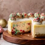 A festive and indulgent Sugar Cookie Cheesecake featuring a buttery sugar cookie crust, vanilla speckled cheesecake studded with sprinkle-filled cookie dough balls, all topped with a silky white chocolate ganache and vibrant Christmas sprinkles. This rich dessert combines the best of cookie dough and cheesecake for a holiday-worthy treat.