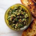 For a party, I like serving the pesto in a small bowl surrounded by toasted baguette slices, crudité, and even some marinated olives. Another fun idea I tried was swirling this pesto into plain ricotta on crostini—it’s a total crowd-pleaser and looks stunning.