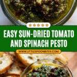 To make this Sun-Dried Tomato and Spinach Pesto Recipe vegan, simply skip the parmesan and swap in nutritional yeast for that cheesy flavor. You can also experiment with blanched almonds or cashews to add creaminess.