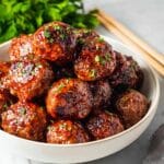 I’ve frozen these meatballs both before and after glazing. For best results, flash freeze the raw meatballs on a baking sheet, then transfer them to a zip-top bag. When ready to use, bake from frozen, and prepare the glaze fresh. Frozen cooked meatballs reheat well too — just add the glaze after reheating.