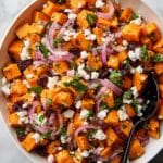 A vibrant and healthy Sweet Potato Salad featuring roasted sweet potatoes and red onions, tossed with a tangy homemade dressing, dried cranberries, crumbled feta, and fresh parsley. This salad is perfect as a flavorful fall side dish or a satisfying, nutritious lunch option.