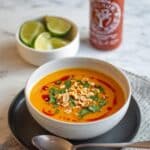 - Serve and Garnish: Ladle the soup into bowls. Drizzle with Sriracha for a spicy kick and garnish with sliced scallions, roughly chopped peanuts, and fresh cilantro leaves.