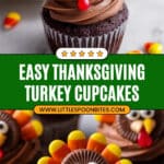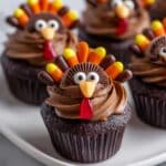Delightful Turkey Cupcakes perfect for Thanksgiving celebrations. These moist chocolate cupcakes are topped with rich cocoa frosting and decorated with fun candy embellishments to resemble festive turkeys. Made from scratch with quality ingredients, they bring both flavor and playful charm to your holiday dessert table.