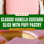 This Vanilla Custard Slice features flaky puff pastry layered with creamy, smooth vanilla custard and topped with a sweet pink icing. Perfect for a nostalgic treat, this easy recipe mimics the classic bakery-bought vanilla slice and delivers a delightful combination of textures and flavors.