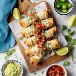 I’ve had great success making a taquito platter for parties by arranging them like little golden cigars on a large board, surrounded by mini bowls of assorted salsas, guacamole, and pickled jalapeños. It’s always a hit visually and lets everyone customize their bites. Another fun idea is stacking taquitos in a vertical “tower” and securing them with a skewer for a playful appetizer presentation.