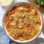 I don’t usually freeze this recipe because the zucchini and summer squash can turn mushy after thawing. But if you want to freeze, I’d suggest undercooking the veggies slightly first and freezing the sauce separately from cooked pasta for best texture.
